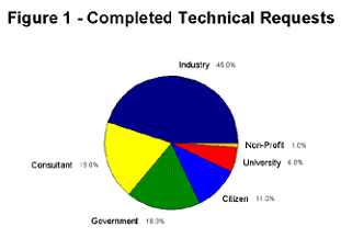 Since the inception of the Division in October 1993, the Information Center has responded to more than 1,600 requests for technical assistance from industry, government, private citizens, non-profit groups, trade associations, consultants, and universities. During this reporting period, P2AD responded to 306 technical requests from industry, including 106 requests for on-site visits or assessments. Figure 1 above provides a breakdown of sources of the pollution prevention technical requests received during FY 96 – 97. Table 2 below provides a breakdown of the total number of requests by general type.